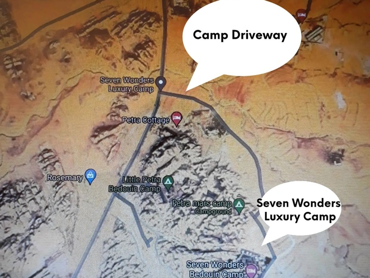 If you have Google Maps please type in as the destination Seven Wonders Luxury Camp or use the coordinates 30.373905 35.458670 . BOTH WILL TAKE YOU TO THE BEGINNING OF OUR DRIVEWAY.